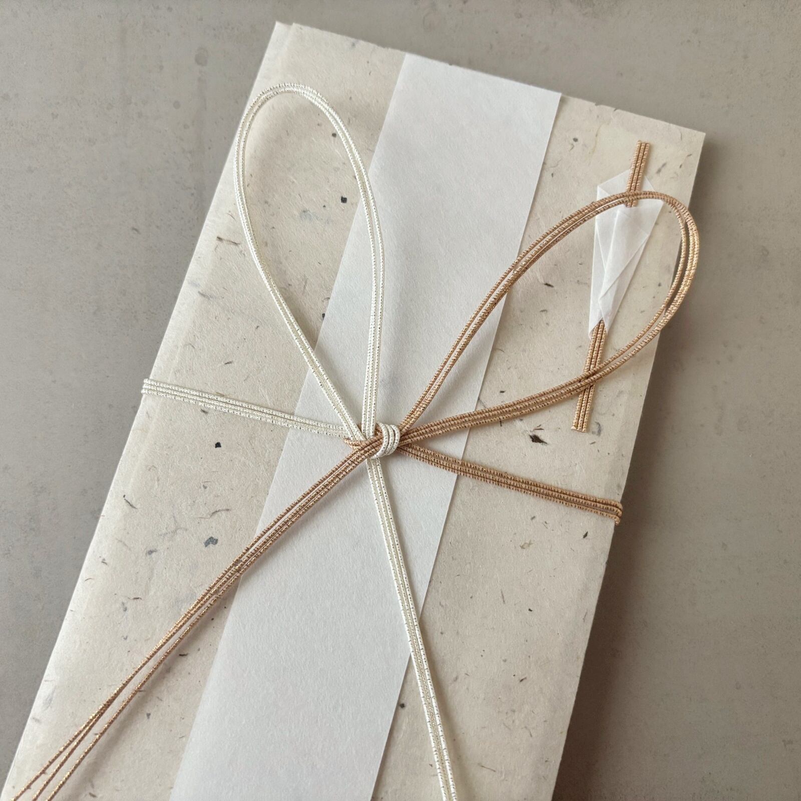 水引には上品なラメを含んだプラチナ水引を合わせ、悠久紙の風合いと調和しながら華やかさを添えています。