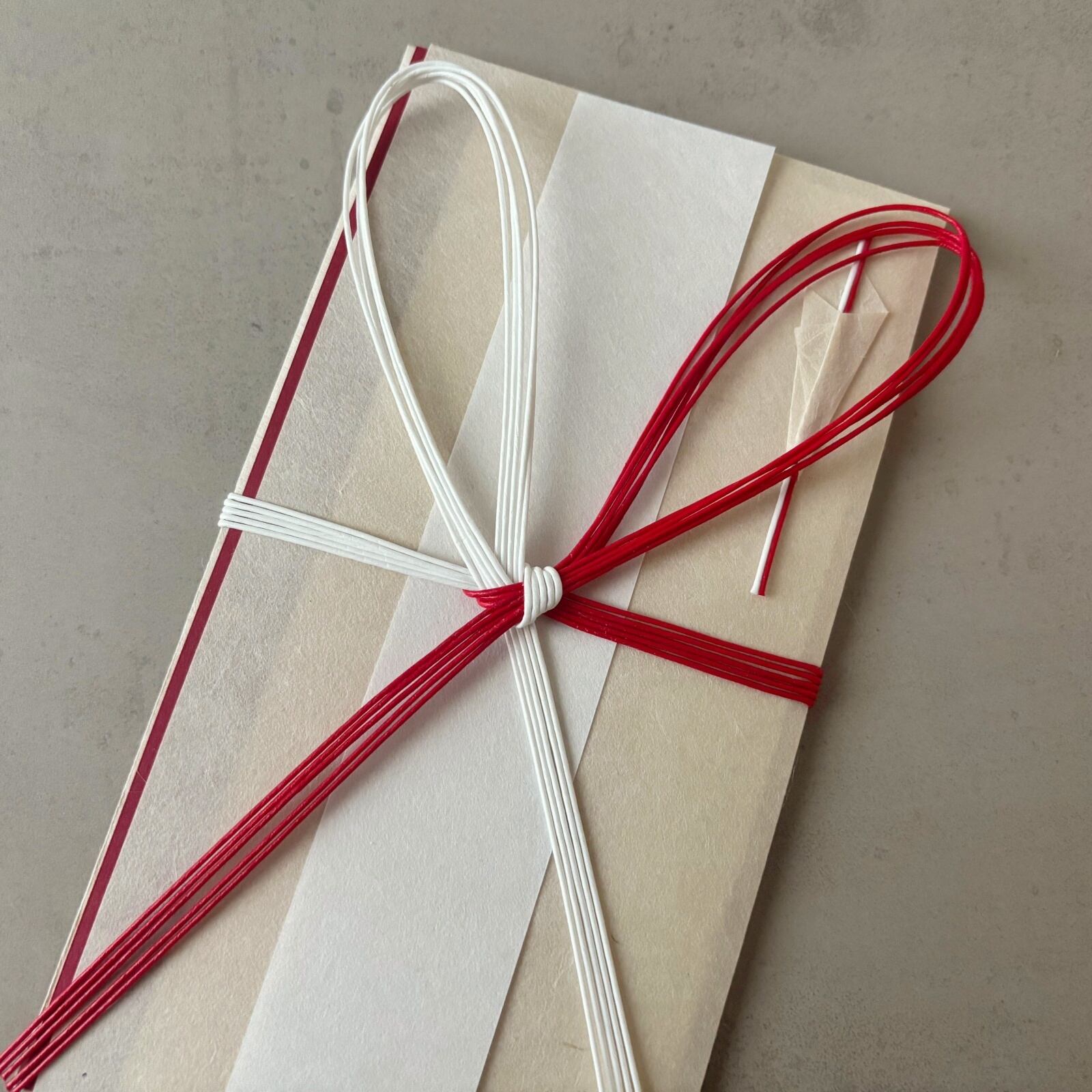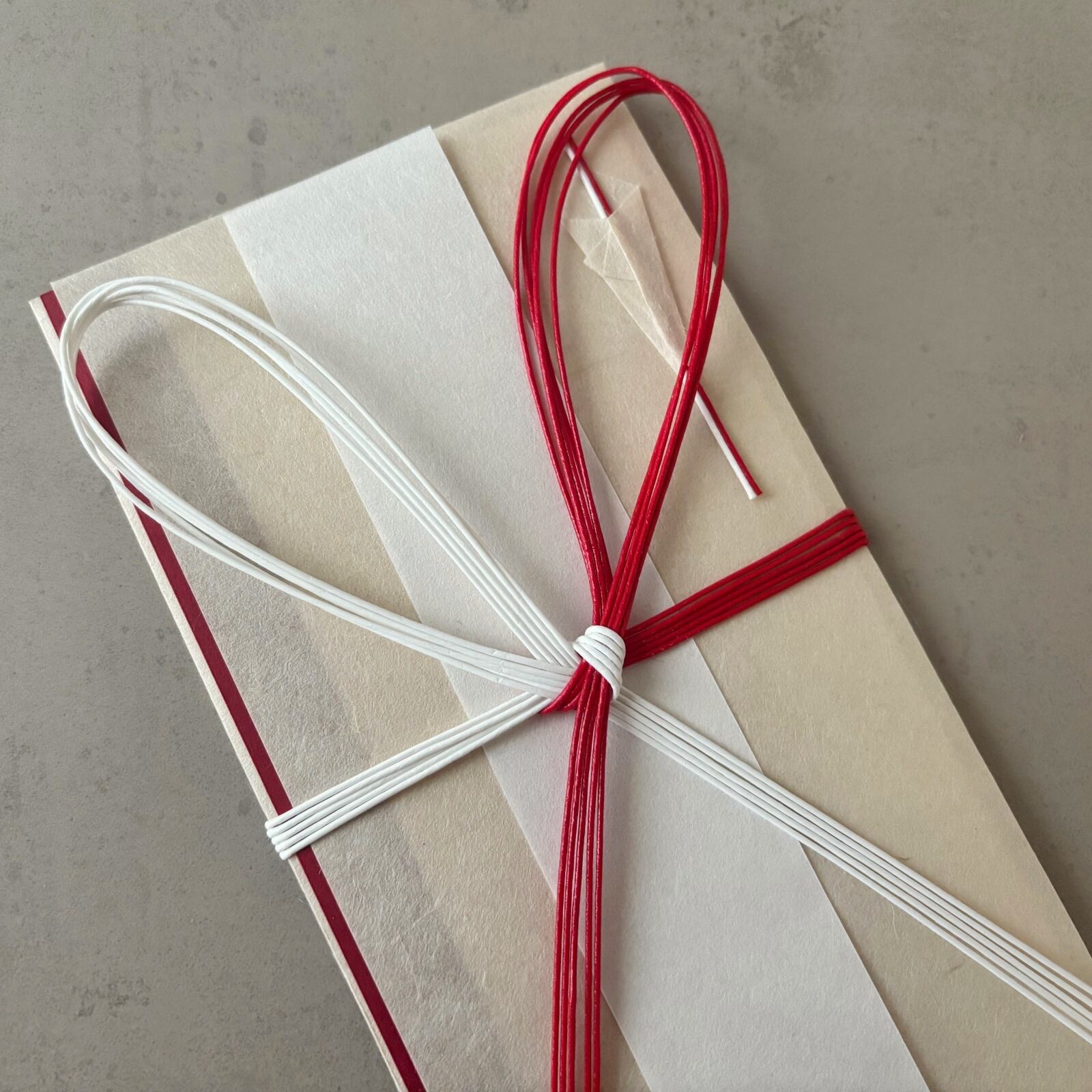 水引には、華やかで清らかな紅白の飯田水引を使用。水引原紙の上に直接色を染めた、水引の源流をなすものを使っています。黒谷和紙の自然な色合いに映え、落ち着いた華やかさを添えます。