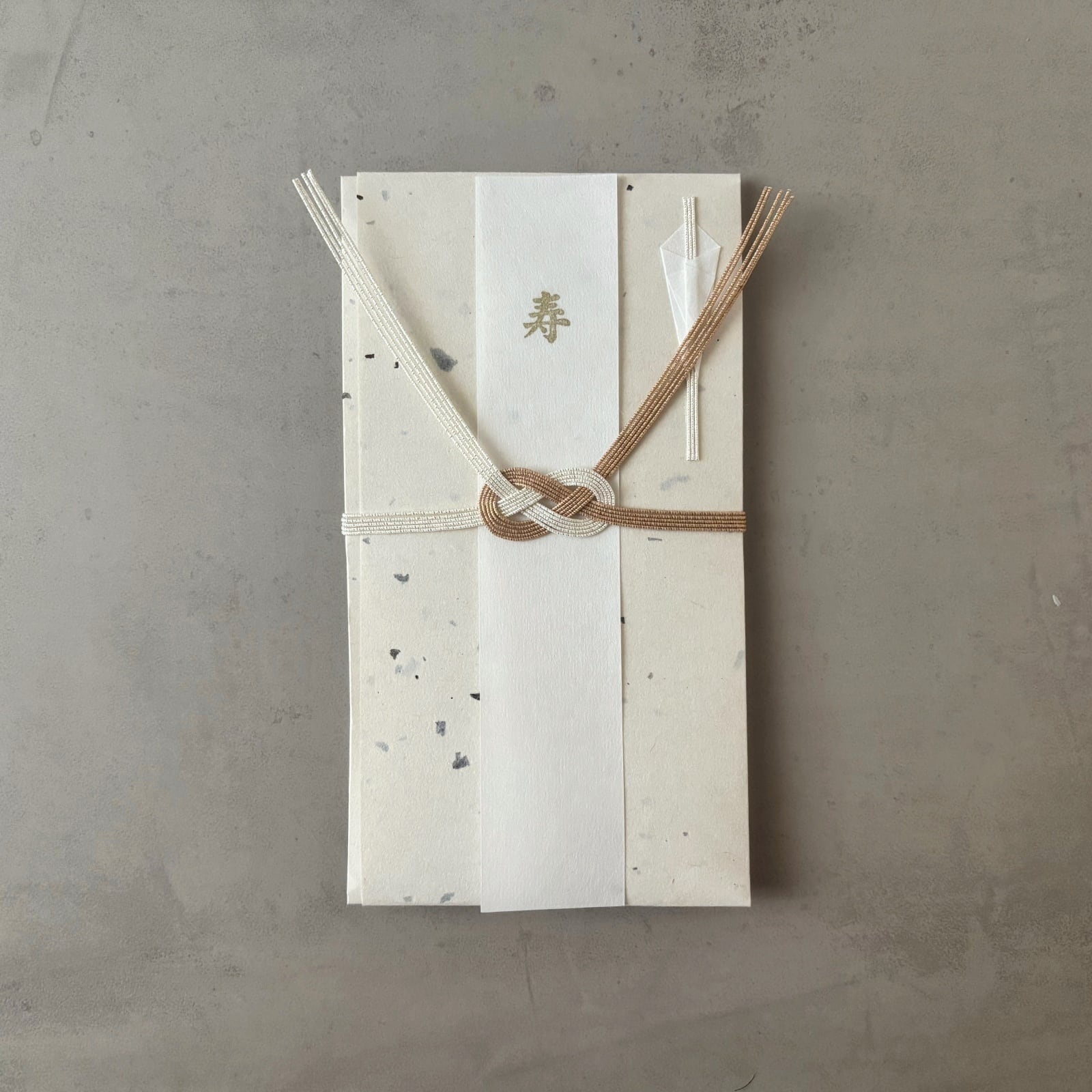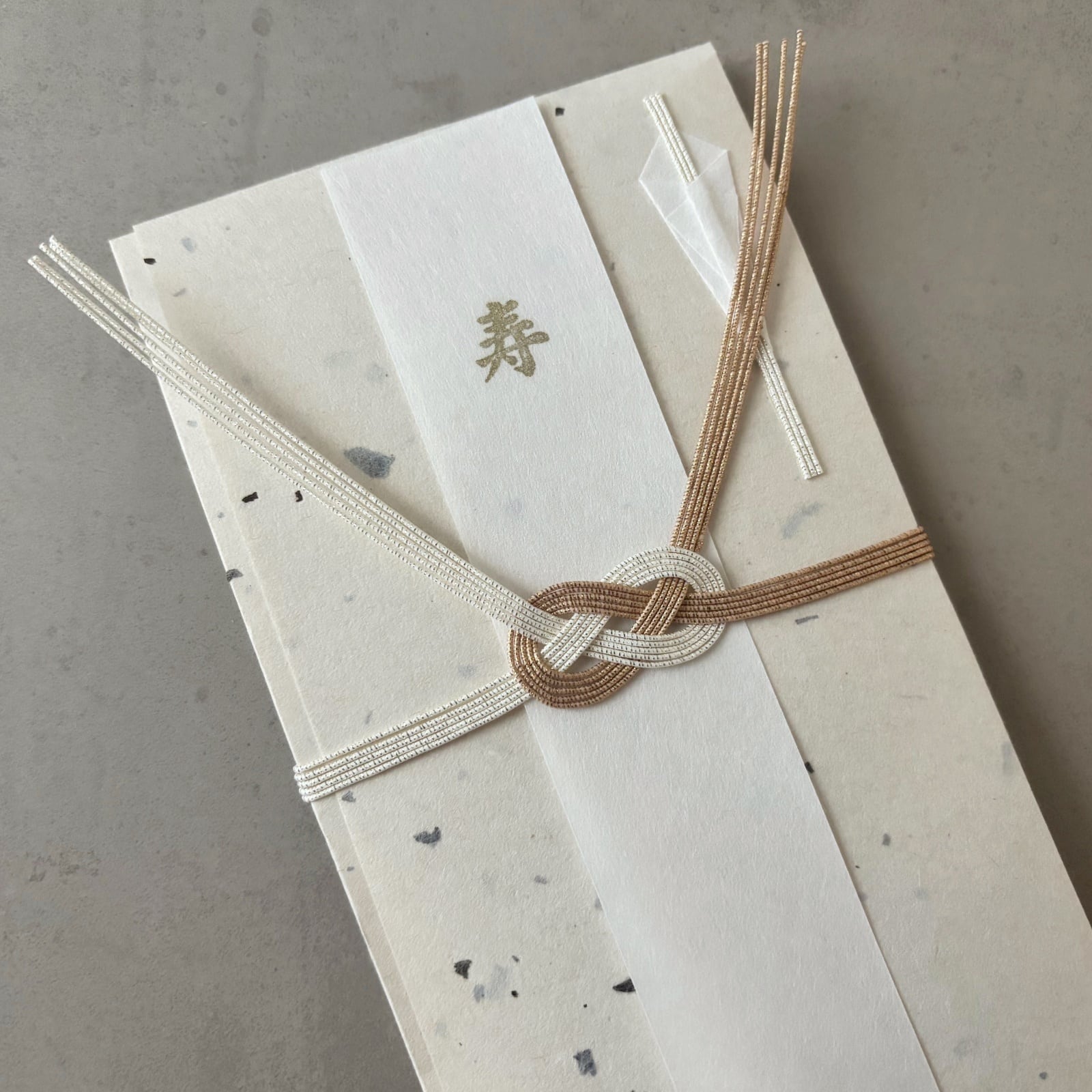 水引には上品なラメを含んだプラチナ水引を合わせ、「小雪和紙」の柔らかな色合いと調和しながら、華やかさを添えています。